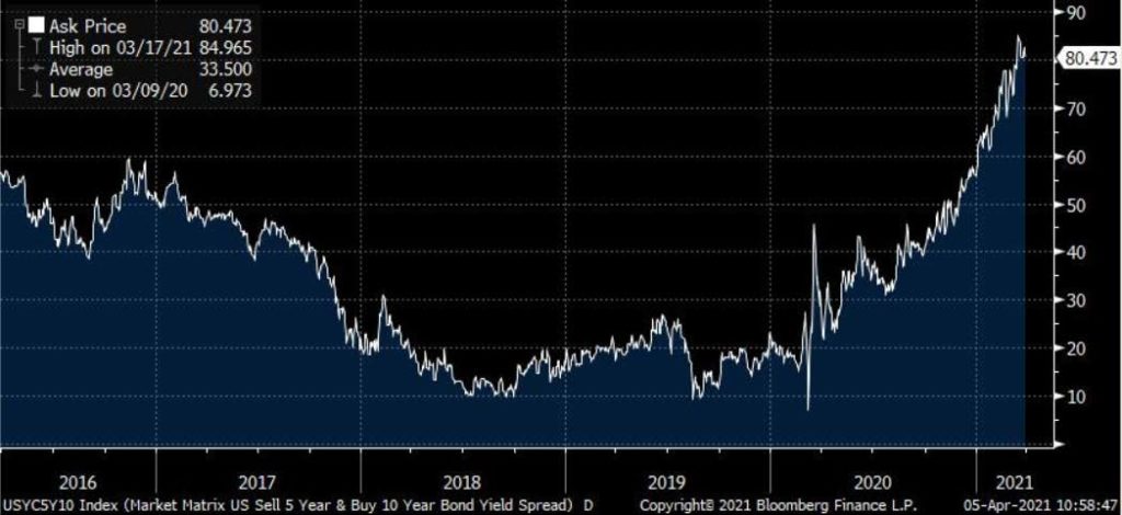 After the corporate index posted a cumulative gain of almost 25% over the previous two years through the end of 2020, most of it on the back of tighter spreads and lower rates, it is fair to expect a pull-back at some point. The current quarter’s performance can almost entirely be defined by Treasuries reclaiming some of the ground that they gave up during the pandemic. Recall that the 10yr Treasury closed as high as 1.88% in the early months of 2020 before falling as low as 0.51% in August of last year and now closing the first quarter of 2021 at 1.74%. But there is more to the story than a higher 10yr Treasury and a closer look at the Treasury curve reveals some more interesting details, particularly the spread between the 5yr and 10yr Treasury. As you can see from the below chart, the 5/10 Treasury curve has steepened substantially over the course of the past year.