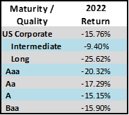 There was nowhere to hide in 2022, with all buckets of maturities and credit ratings posting negative returns. Intermediate credit performed relatively better than longer dated credit due to its lower duration. A-rated credit performed slightly better than the index as a whole and it outperformed both >Aa-rated credit and Baa-rated credit but the returns picture was ugly across the board.