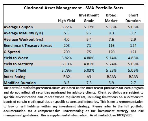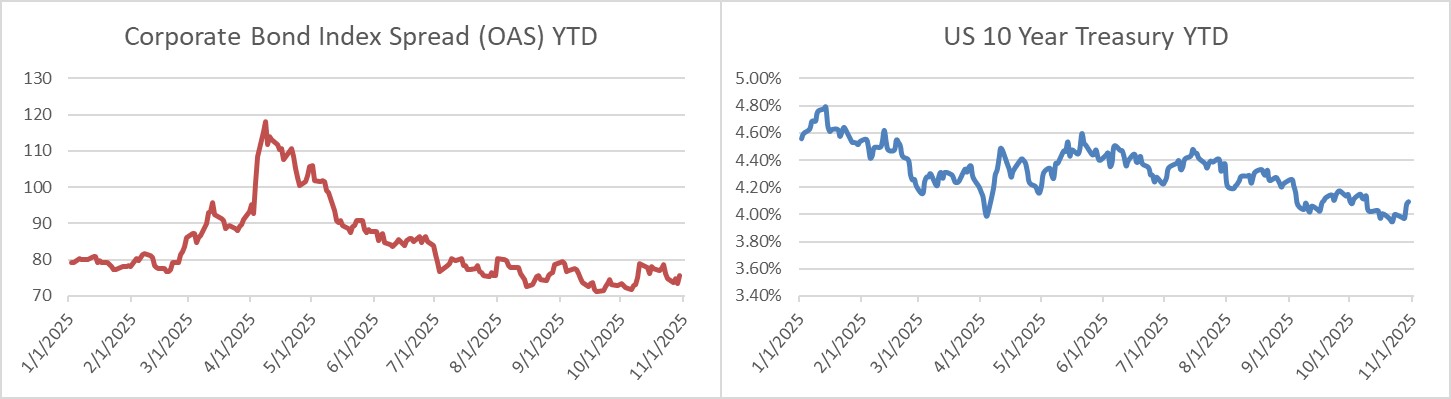 Credit spreads will finish wider this week. The OAS on the Corporate Index closed at 76 on Thursday October 30th after closing the week prior at 75. Although this was a very modest move wider the market “feels” a bit heavier as we go to print on Friday. Investors are busy processing earnings releases as well as a large amount of new issue supply so we would expect the spread on the index to finish the week 1-2 basis points wider than 76. Spreads are still very much rangebound over the past few months as the OAS on the index has not traded wide of 80 since early August. Treasury yields moved slightly higher throughout this week. The 10yr Treasury closed last week at 4.00% and the benchmark rate closed at 4.10% on Thursday evening. Through Thursday, the Corporate Bond Index year-to-date total return was +7.54% while the yield to maturity for the index was 4.80%.