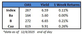 - Yields were unchanged on Thursday, and are now just two basis points above the multi-year low of 6.57%. Spreads closed at a five-week low of 267 basis points and just 11 basis points above the year-to-date low.