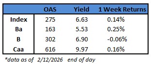 - US junk bonds tumbled, yields rose and risk premiums surged as anxieties over artificial intelligence boiled over, causing a broad reassessment of riskier assets. Yields jumped the most in three weeks to 6.63% and spreads widened the most in four months to 275 basis points.