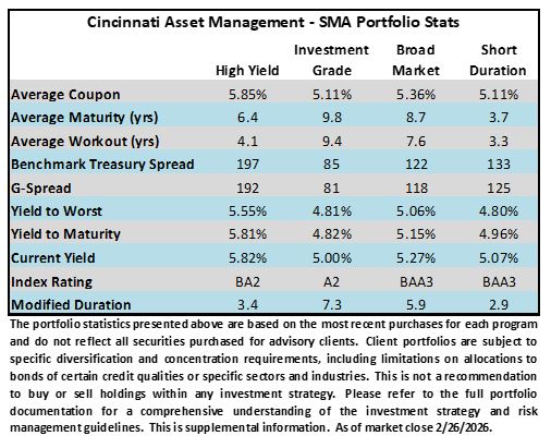 Credit spreads moved wider this week. The OAS on the Corporate Index closed at 82 on Thursday February 26th after closing the week prior at 77. The 10yr Treasury closed last week at 4.08% and had closed at 4.0% on Thursday before breaching 4% on Friday morning. If the current level holds, today will be the first time the 10yr has closed below 4% since the end of November. Through Thursday, the Corporate Bond Index year-to-date total return was +1.36% while the yield to maturity for the index was 4.75%.