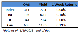 - CCC yields, the riskiest part of the market, breached the 11% level to close at a nine-month high of 11.05%. BB yields also rose to a new nine-month high at 6.14%, on track for a fourth weekly rise, the longest such streak since April 2025.