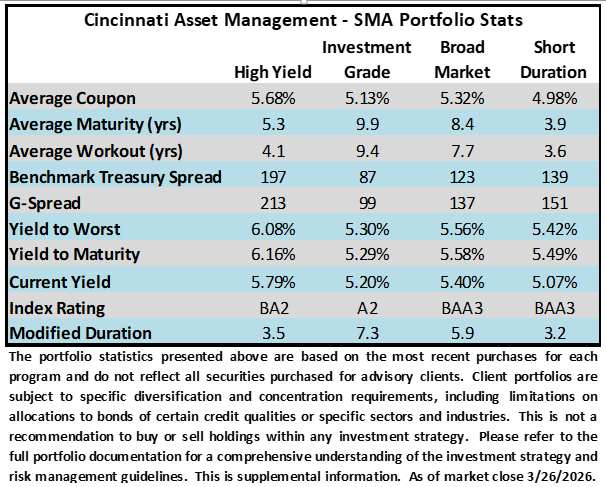 It was another volatile week for risk assets with plenty of headlines to parse and lots of risk reversals depending on the social media post of the day (or minute) regarding Iran. Equities continued to bear most of the brunt and IG credit was particularly well behaved. Investment grade credit is lower on the risk spectrum relative to most other assets and higher yields have drawn investor interest which has helped support spreads. On the economic front, it was a light week for meaningful data. Next week things ramp up with consumer confidence, retail sales, vehicle sales and then finally the nonfarm payroll report on Friday morning.