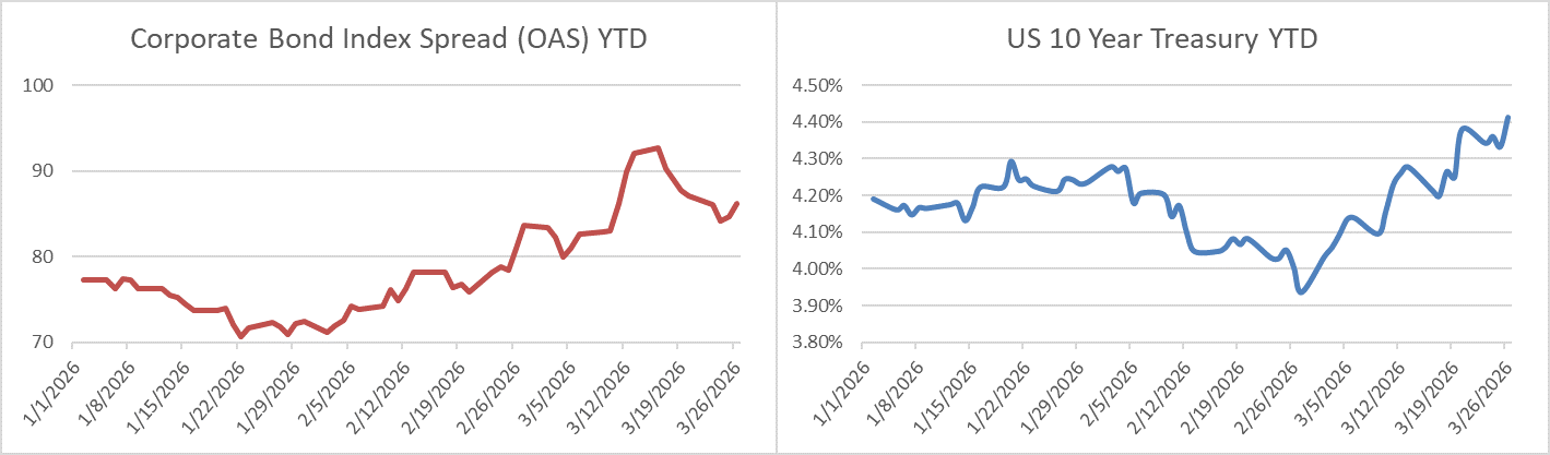 Credit spreads were tighter on the week through Thursday but Friday’s price action is indicating that the market will finish the period unchanged. The OAS on the Corporate Index closed at 86 on Thursday March 26th after closing the week prior at 87. The 10yr Treasury ended last week at 4.38% and it closed at 4.41% on Thursday evening. Through Thursday, the Corporate Bond Index year-to-date total return was -1.20% and the yield to maturity for the index was 5.26%.