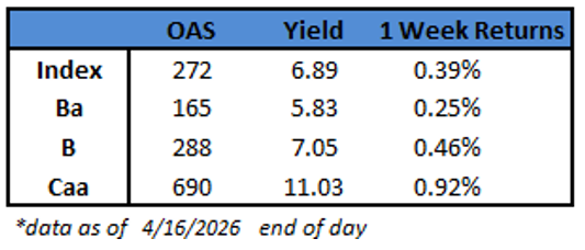 - A steady three-day rally and still-compressed spreads well below 300 basis points powered a supply boom in the junk bond primary market this week. Large cash inflows into the asset class drove the week’s supply to $15b, the busiest since September 2025.