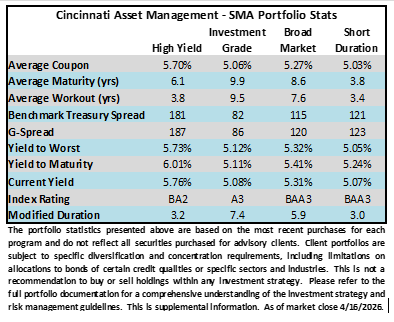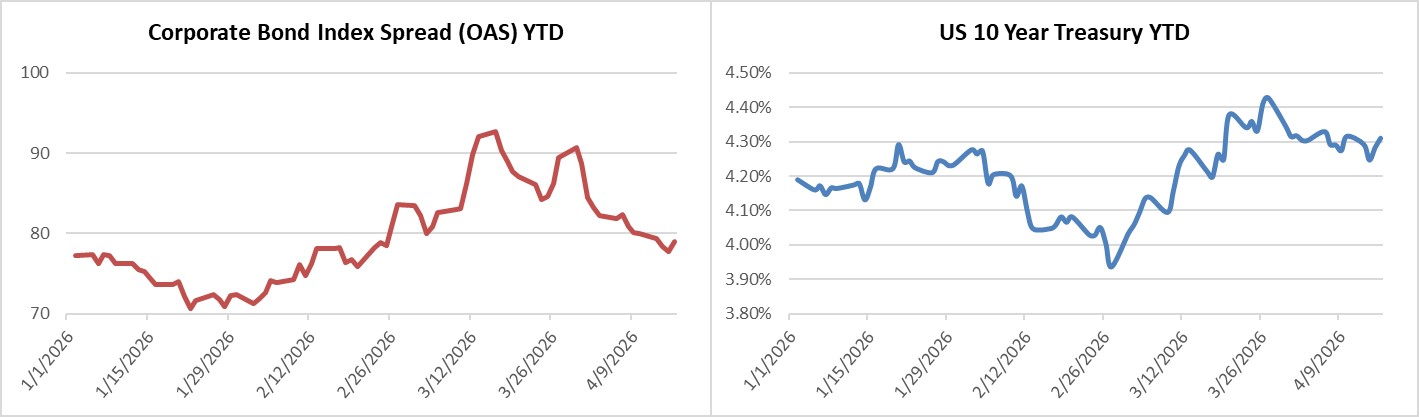 Credit spreads were slightly tighter on the week through Thursday and Friday morning is seeing some positive price action as well. The OAS on the Corporate Index closed at 79 on Thursday April 16th after closing the week prior at 80. For context, the Index OAS is now several basis points better than where it was just prior to the beginning of the Iran conflict. The 10yr Treasury ended last week at 4.32% and it closed at 4.31% on Thursday evening. Through Thursday, the Corporate Bond Index year-to-date total return was +0.34% and the yield to maturity for the index was 5.04%.