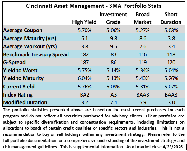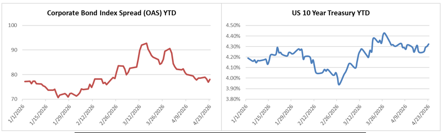 Credit spreads were modestly tighter on the week through Thursday. The OAS on the Corporate Index closed at 78 on Thursday April 23rd after closing the week prior at 79. The 10yr Treasury ended last week at 4.25% and it closed at 4.32% on Thursday evening. Through Thursday, the Corporate Bond Index year-to-date total return was +0.42% and the yield to maturity for the index was 5.06%.