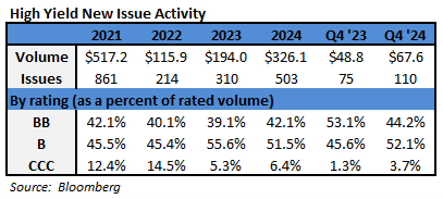 With regard to ratings segments of the High Yield Market, BB-rated securities tightened 3 basis points, B-rated securities tightened 18 basis points, and CCC-rated securities tightened 73 basis points. The chart below from Bloomberg displays the spread move of the Index over the past five years. For reference, the average level over that time period was 355 basis points.