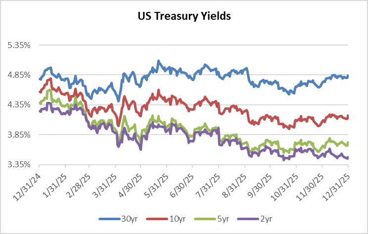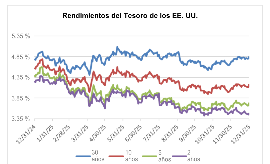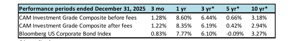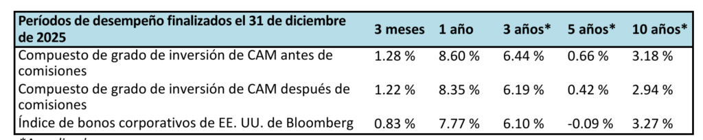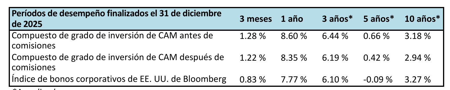 Los rendimientos más bajos de los bonos del Tesoro fueron una bendición para el rendimiento de los bonos con grado de inversión intermedio en 2025. Los bonos del Tesoro a 2, 5 y 10 años cerraron el año con una caída de 77, 66 y 40 puntos básicos, respectivamente. No sorprende que los rendimientos de los bonos del Tesoro a corto plazo disminuyeran junto con la decisión del FOMC de reducir su tasa de política en 75 puntos básicos en la segunda mitad del año. Por otro lado, los bonos del Tesoro a 30 años se mantuvieron obstinadamente elevados, y cerraron el año 6 puntos básicos por encima de donde comenzaron. Recordemos que la Estrategia de Grado de Inversión de CAM es un programa de vencimiento intermedio que no invierte en valores con vencimientos a más largo plazo ni realiza anticipaciones de tasas de interés. En nuestra opinión, es simplemente demasiado difícil predecir con precisión las tasas de interés a largo plazo, especialmente en los extremos más lejanos de la curva.