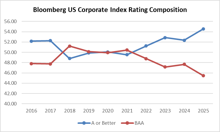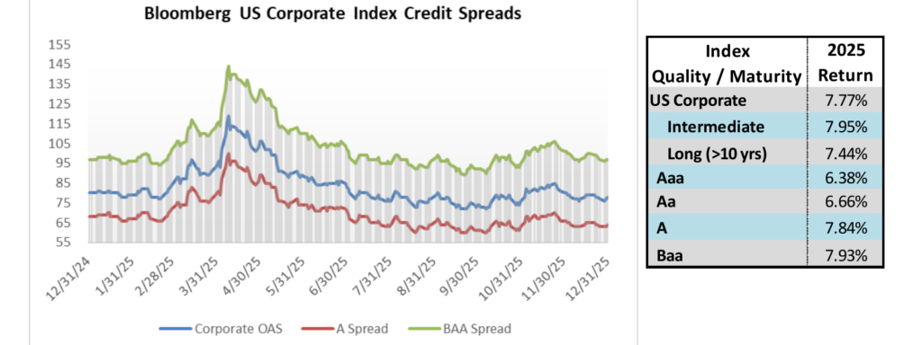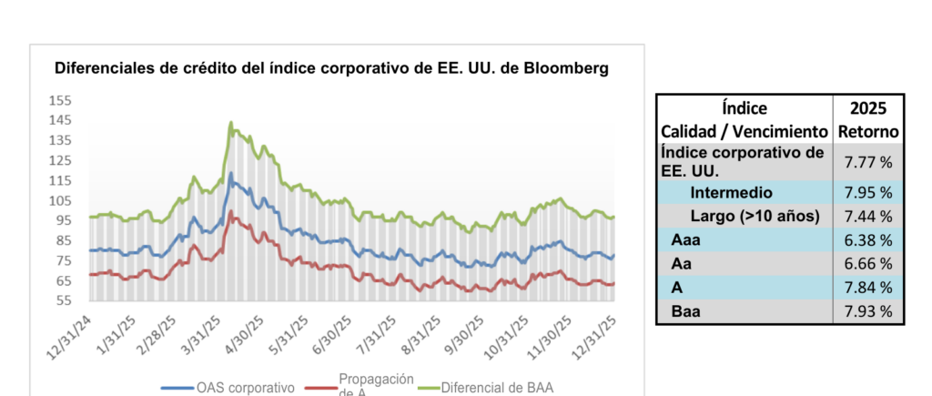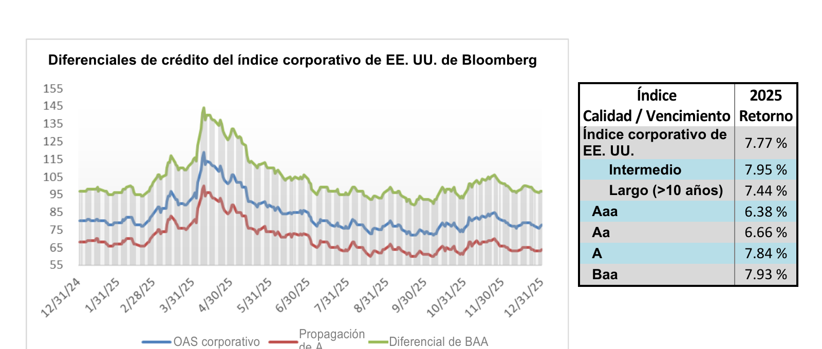 Durante 2025, el diferencial ajustado por opciones (OAS) del índice Bloomberg US Corporate Bond (el Índice) se redujo en 2 puntos básicos hasta situarse en 78, tras comenzar el año en 80. El índice OAS cerró con una amplia diferencia de 119 a principios de abril tras los aranceles del Día de la Liberación, pero el movimiento al alza fue efímero y el Índice volvió a situarse por debajo de 100 a principios de mayo. El crédito de menor calidad superó modestamente al de mayor calidad debido a los cupones cada vez más altos que se ofrecen en el mercado a medida que disminuye la calidad. El crédito a mediano plazo superó al crédito a más largo plazo, ya que los rendimientos de los bonos del Tesoro a corto y mediano plazo disminuyeron a lo largo del año.