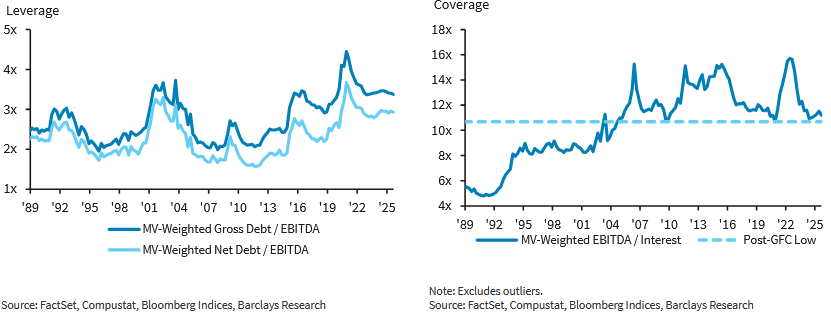 Los fundamentos son estables, pero el riesgo idiosincrásico está aumentando. Los indicadores crediticios máximos han quedado claramente atrás, pero la calidad crediticia fundamental del mercado de IG en general sigue siendo muy sólida. El sector bancario está a la vanguardia en términos de salud crediticia. El apalancamiento no financiero es elevado en relación con 2019, pero es significativamente menor que en 2021, mientras que la cobertura de intereses ha tendido a disminuir para la misma cohorte. En el lado positivo, el EBITDA siguió creciendo y los márgenes de EBITDA alcanzaron otro máximo histórico al final del tercer trimestre, liderados por créditos de gran capitalización y alta calificación.v Lo que se pierde en estas cifras son los datos cualitativos que hemos observado recientemente en el mercado. Nuestra experiencia nos dice que el riesgo único en el mercado de IG ha ido aumentando en los últimos trimestres para determinadas industrias y créditos específicos. Los gestores exitosos deberán centrarse en crear carteras bien diversificadas y evitar a los prestatarios problemáticos. Nos sentimos cómodos abordando estos riesgos como gestores que se centran en las métricas crediticias individuales de los emisores que componen nuestra cartera.