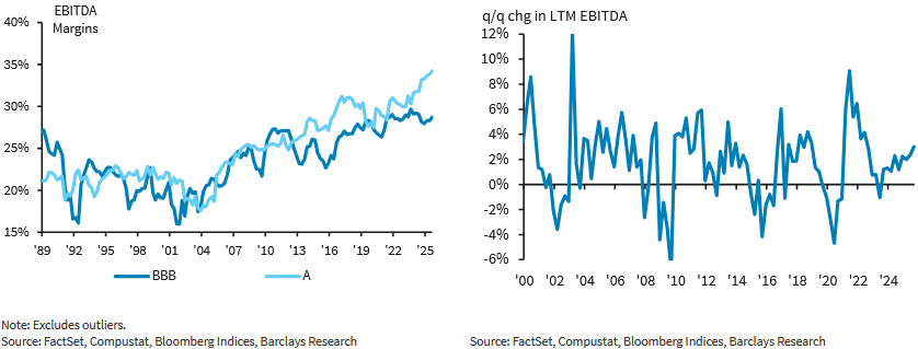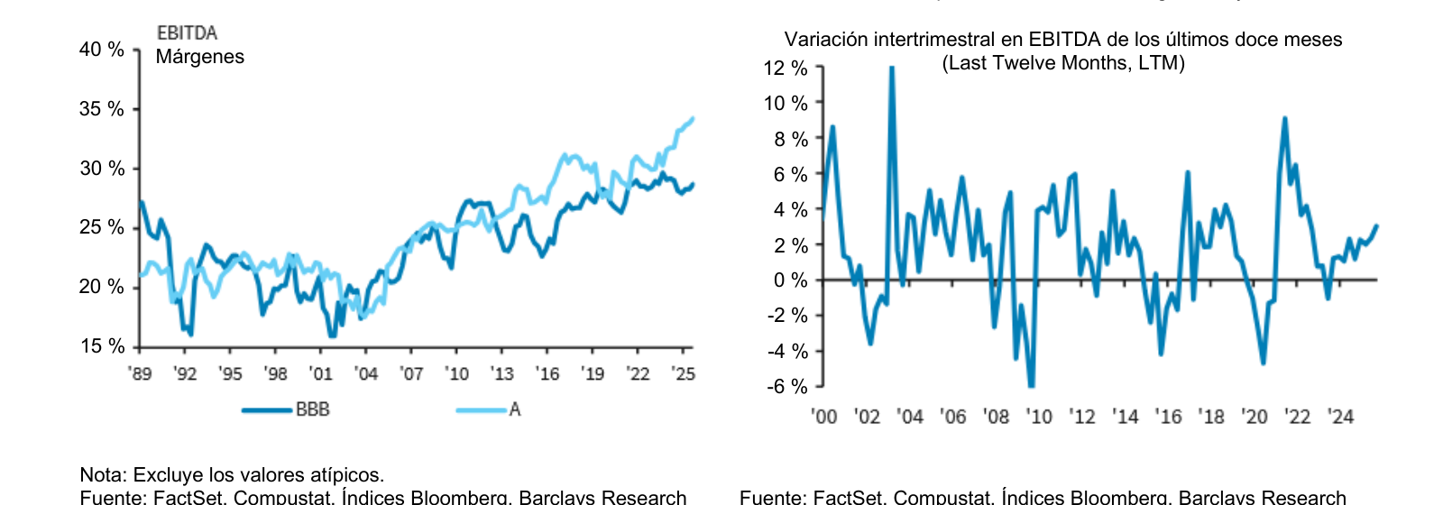 No solo existe una tendencia hacia emisiones de mayor calidad, con empresas con calificación A o superior que representan el 58 % de las emisiones en los últimos años, sino que también se registró un número récord de mejoras de calificación de BAA a A simple en 2025, mientras que las rebajas de calificación alcanzaron un mínimo histórico.vi Esperamos que la calidad del índice pueda seguir aumentando durante los próximos años si los planes de gasto de capital en inteligencia artificial de alta escalabilidad altamente calificados se concretan. Recordemos que el Programa de Grado de Inversión de CAM tiene una ponderación estructuralmente inferior al crédito con calificación BAA, ya que buscamos limitar la exposición de la cartera a una ponderación del 30 % en las partes más riesgosas del mercado de IG.